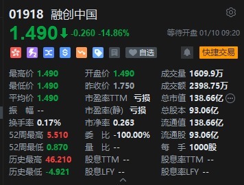 1月10日消息,融创中国大跌近15%,报1.49港元,成交额2398.75万港元。